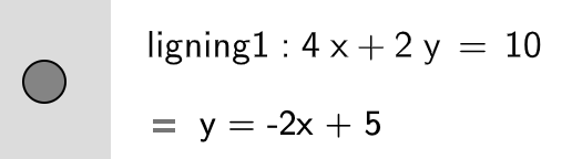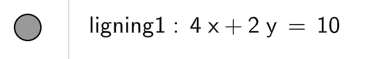 Antag at vi har en begrænsning givet ved \(4x+2y\leq 10\). Vi taster uligheden ind (men som ligning) i GeoGebra: