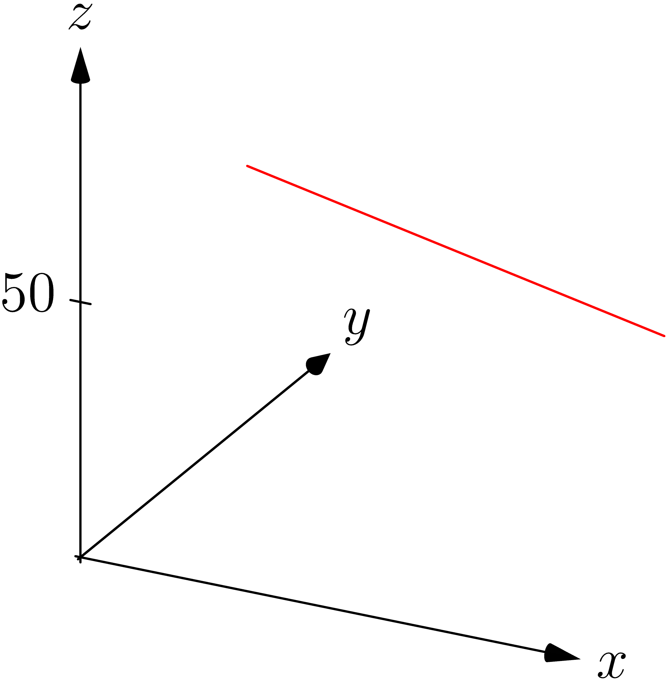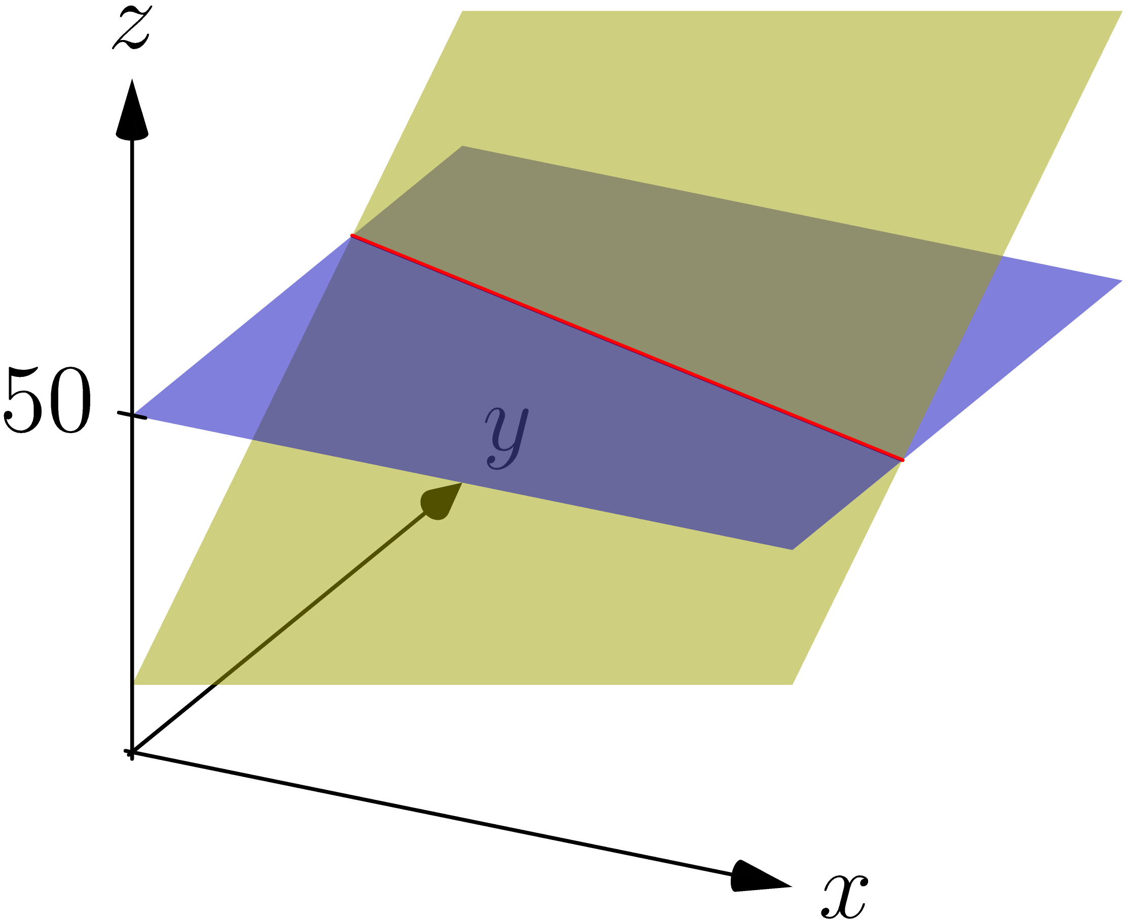 Vi skal bestemme \(N(50).\) Den består af alle de punkter som har en funktionsværdi på \(50\). så derfor tegnes en vandret flade ind i koordinatsystem med en højde på \(50.\)